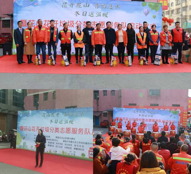娄星在线网讯 12月13日,花山街道联合市民政局、娄底百善社工在新九龙开展“花开花山”冬日送温暖暨“花开花山”垃圾分类志愿服务队启动仪式。