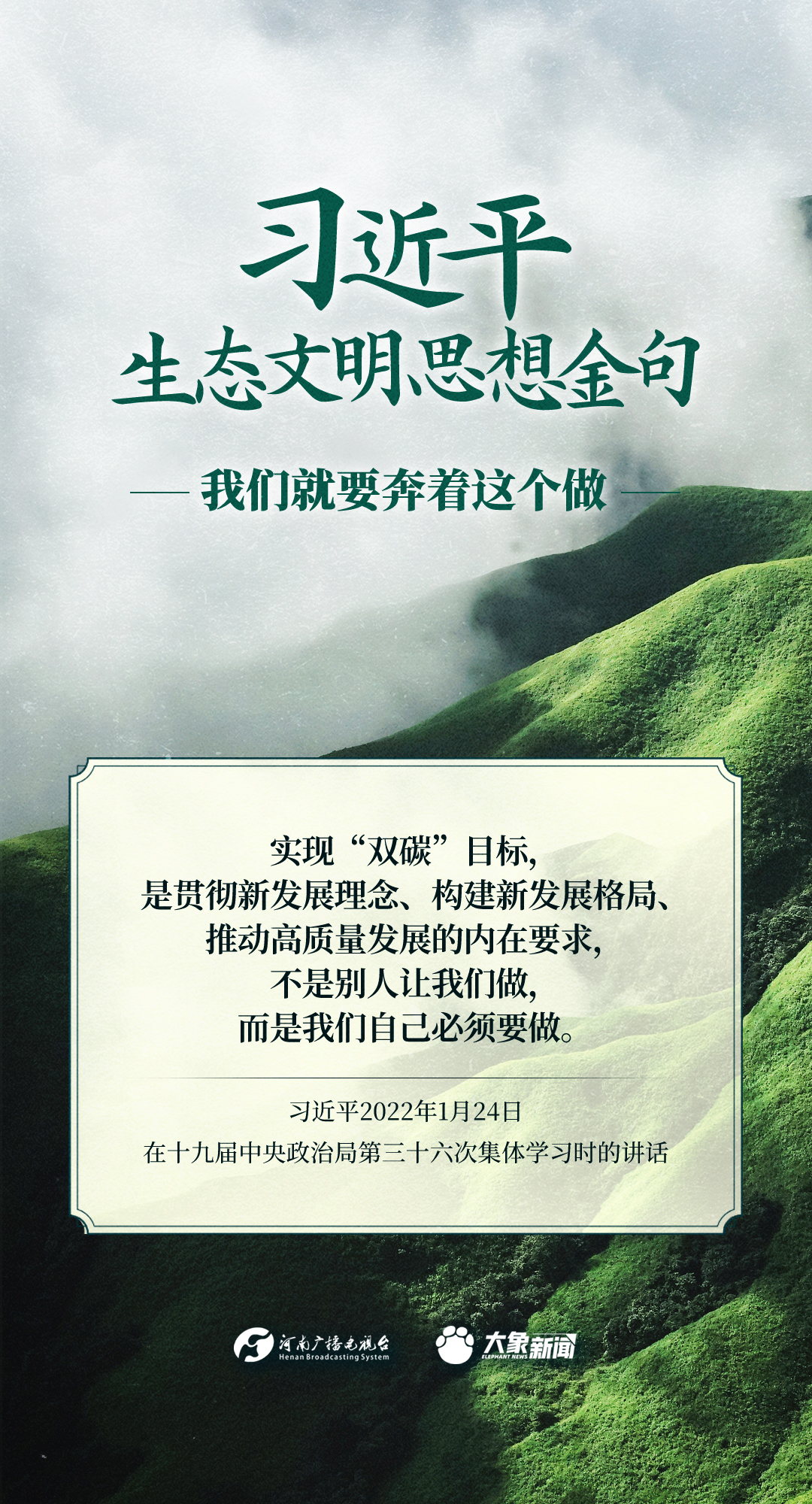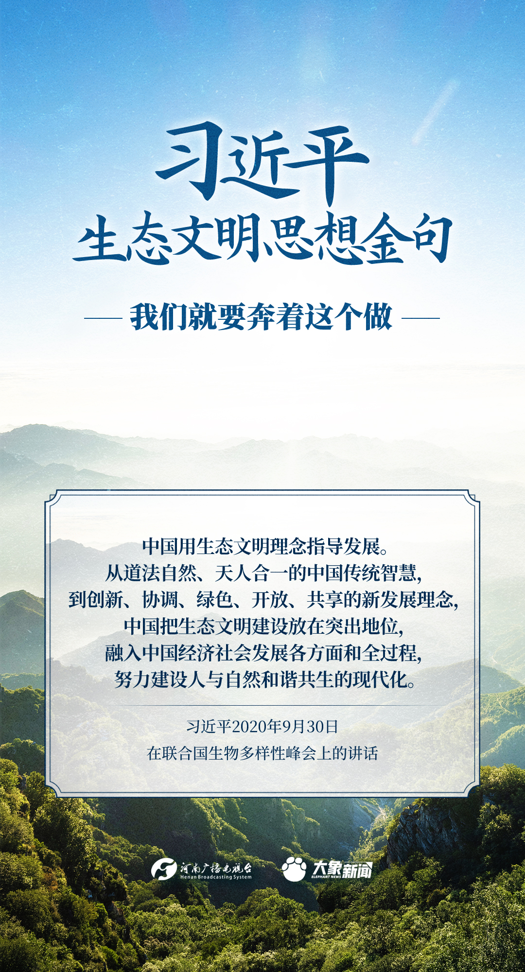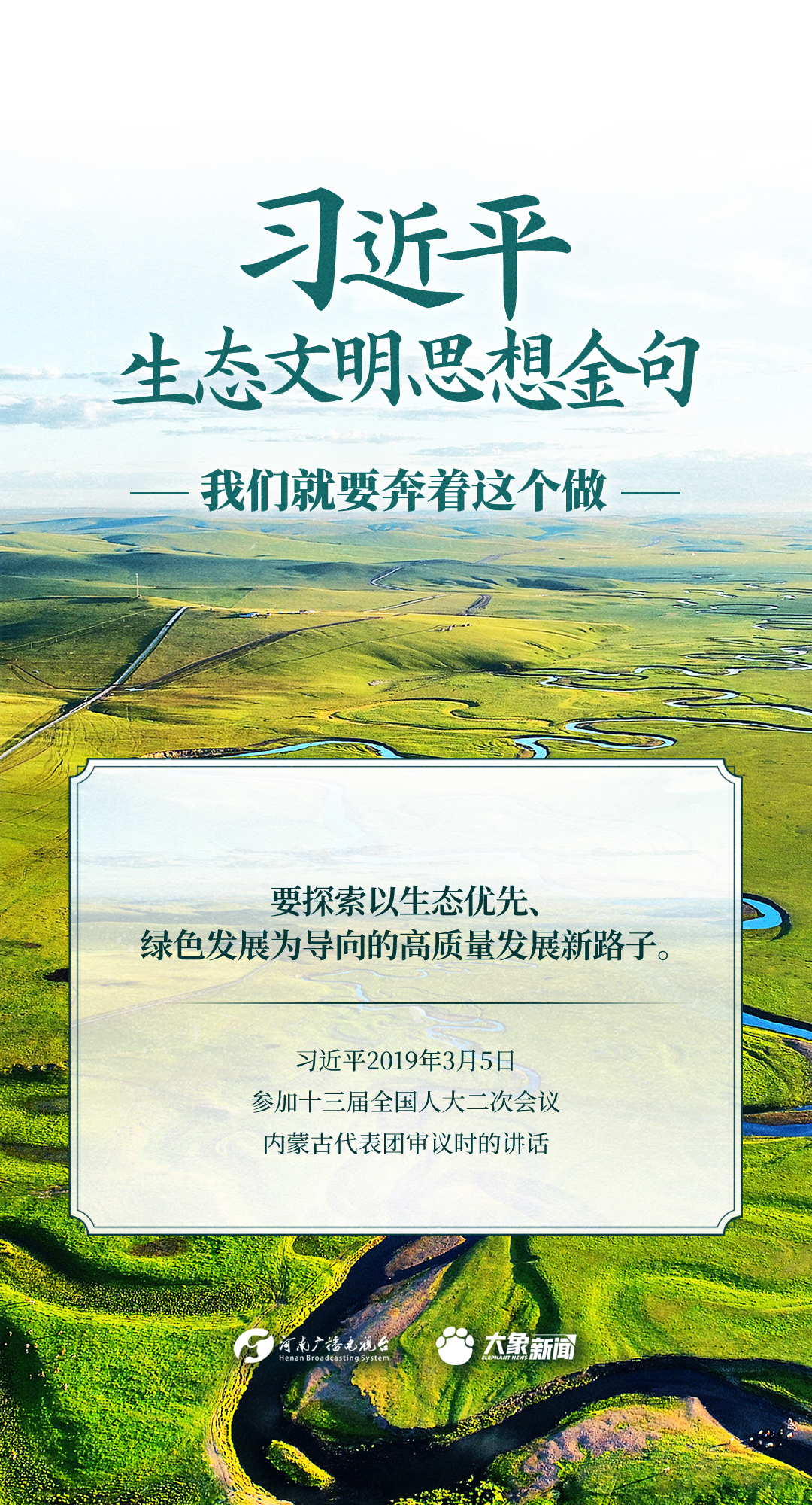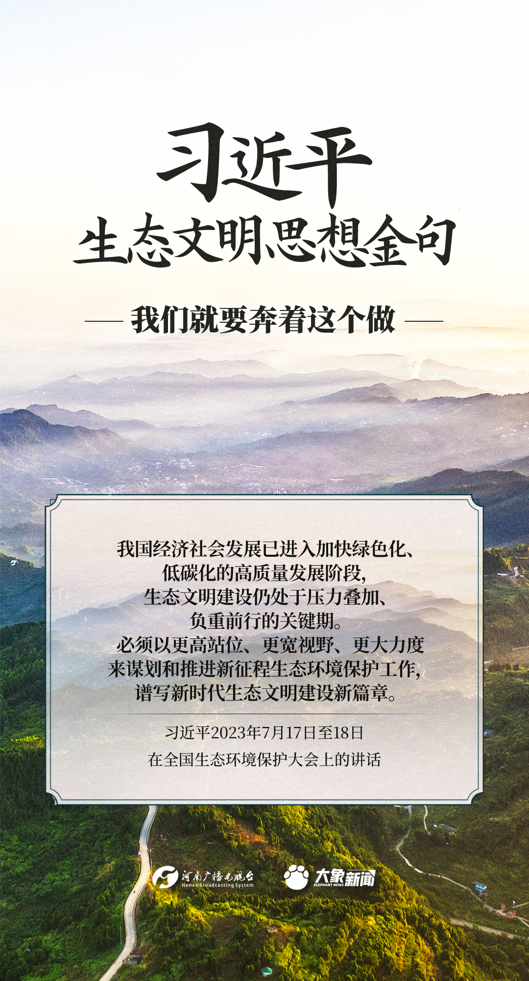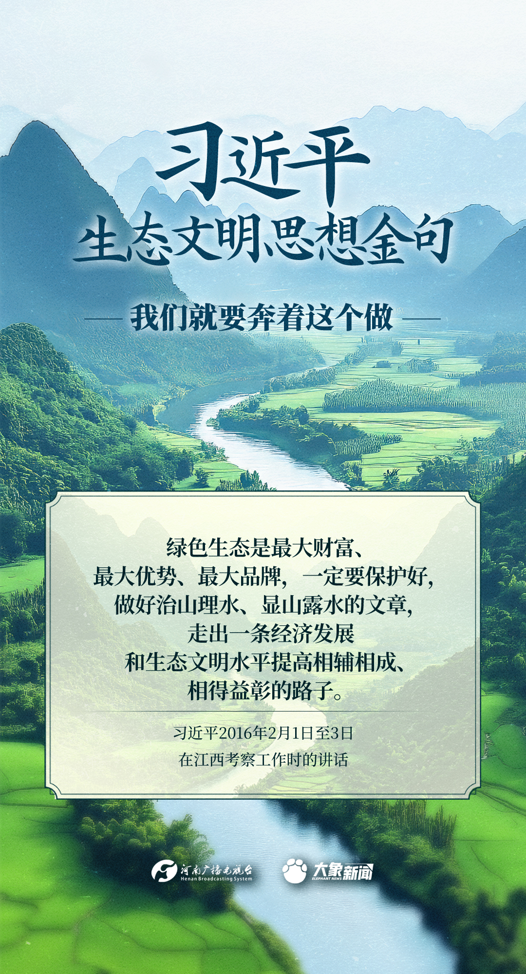 党的十八大以来,习近平总书记把生态文明建设摆在治国理政突出位置,大力推动生态文明理论创新、实践创新、制度创新,创造性提出一系列新理念新思想新战略,形成了习近平生态文明思想,对生态文明建设的时代之问、世界之问、人民之问作出科学解答。大象新闻推出《习近平生态文明思想金句》系列策划,今天推出《我们就要奔着这个做》。