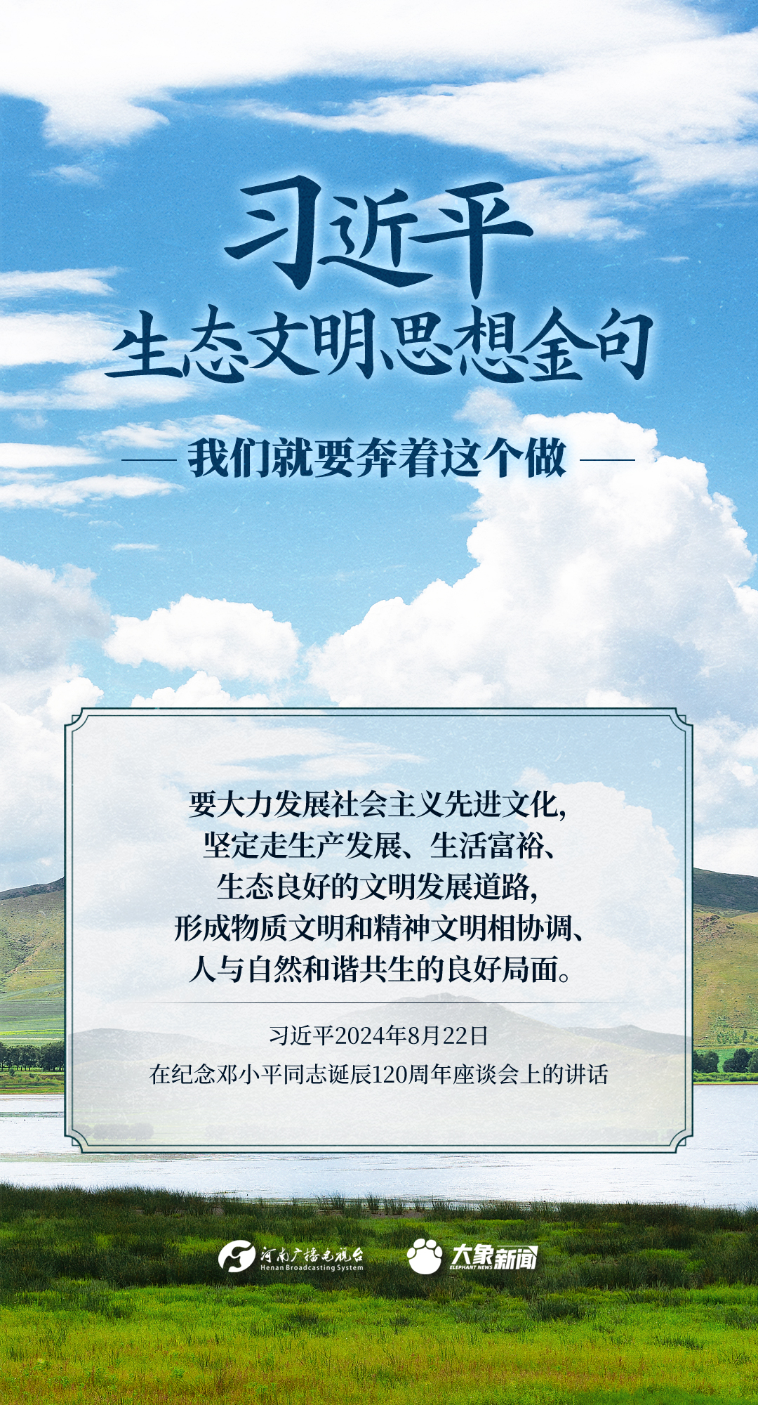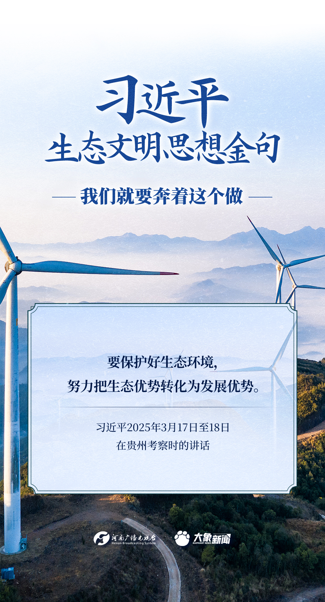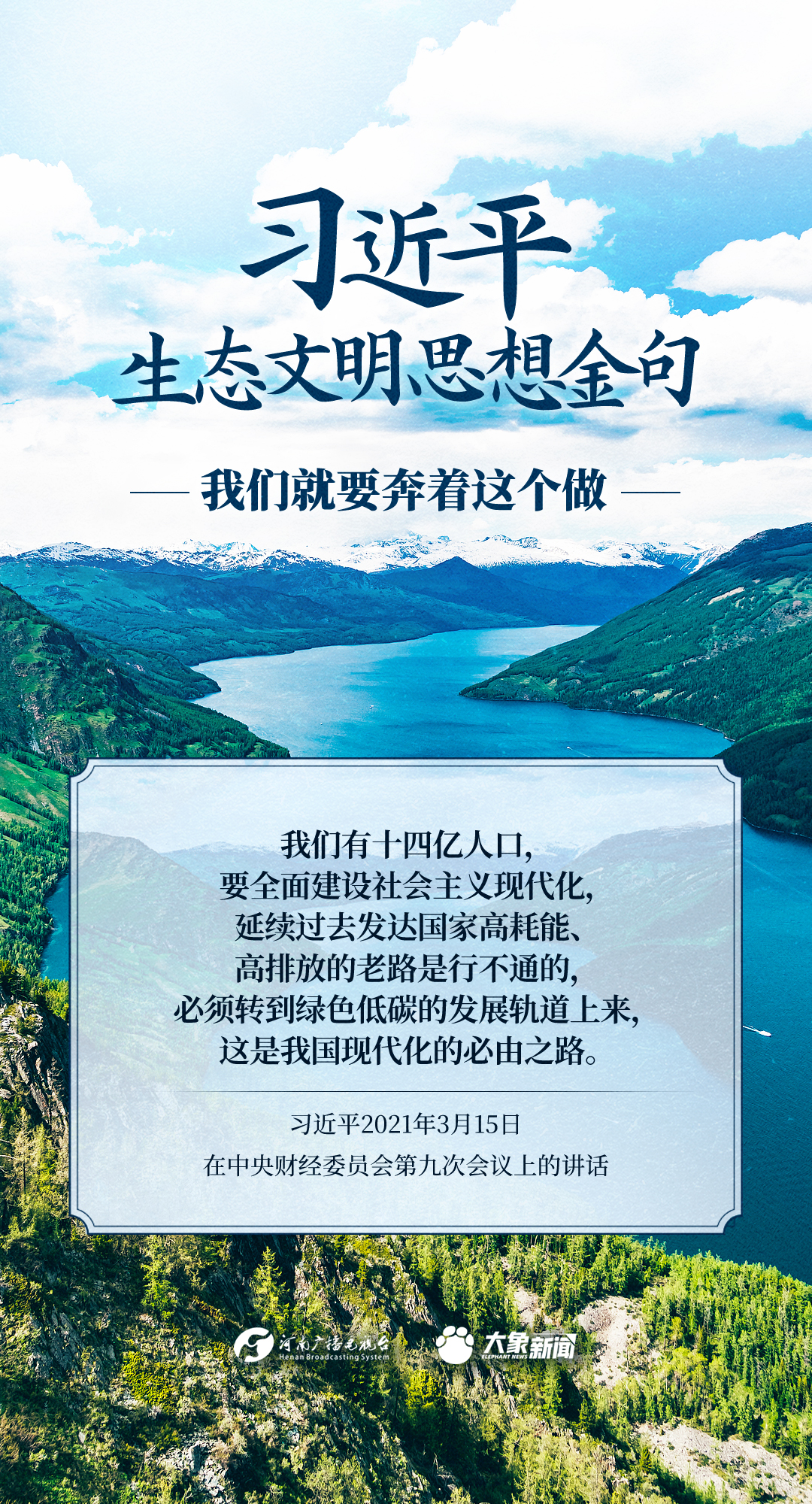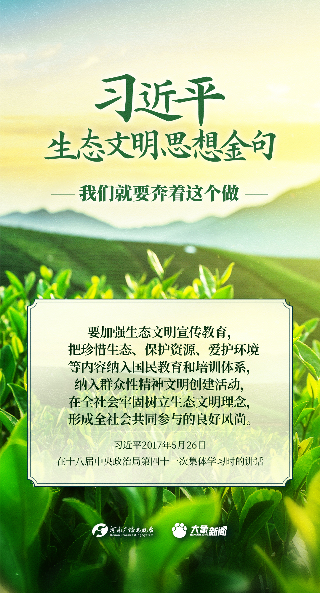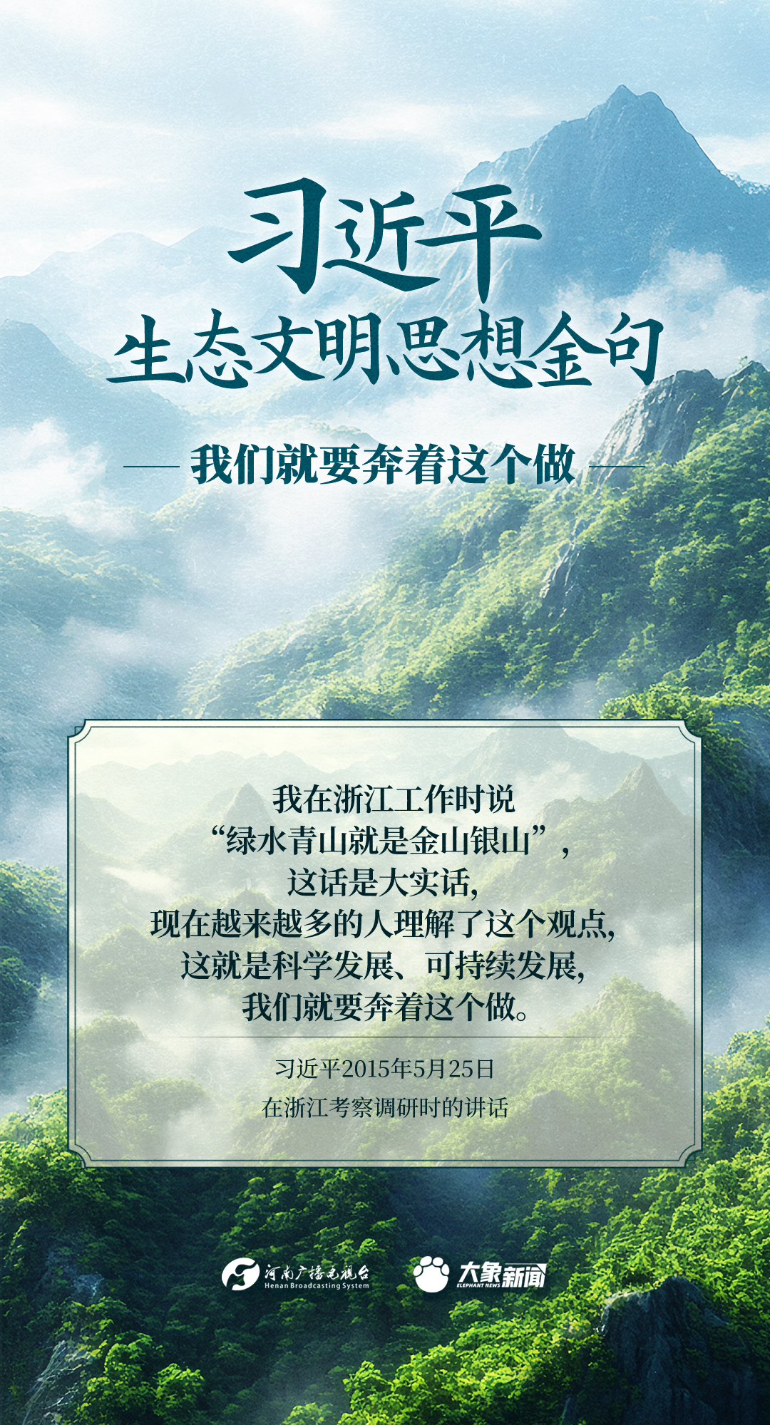 党的十八大以来,习近平总书记把生态文明建设摆在治国理政突出位置,大力推动生态文明理论创新、实践创新、制度创新,创造性提出一系列新理念新思想新战略,形成了习近平生态文明思想,对生态文明建设的时代之问、世界之问、人民之问作出科学解答。大象新闻推出《习近平生态文明思想金句》系列策划,今天推出《我们就要奔着这个做》。