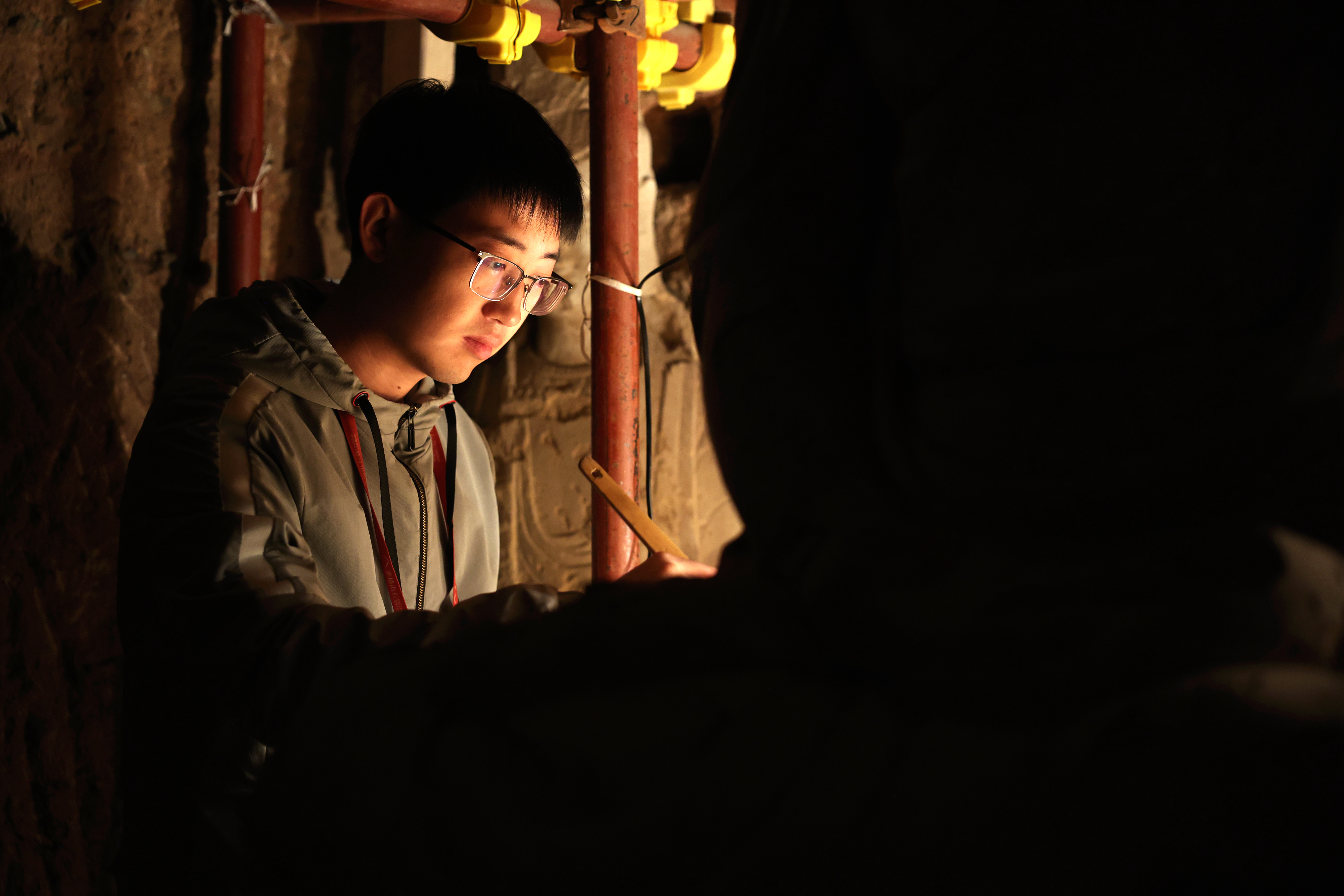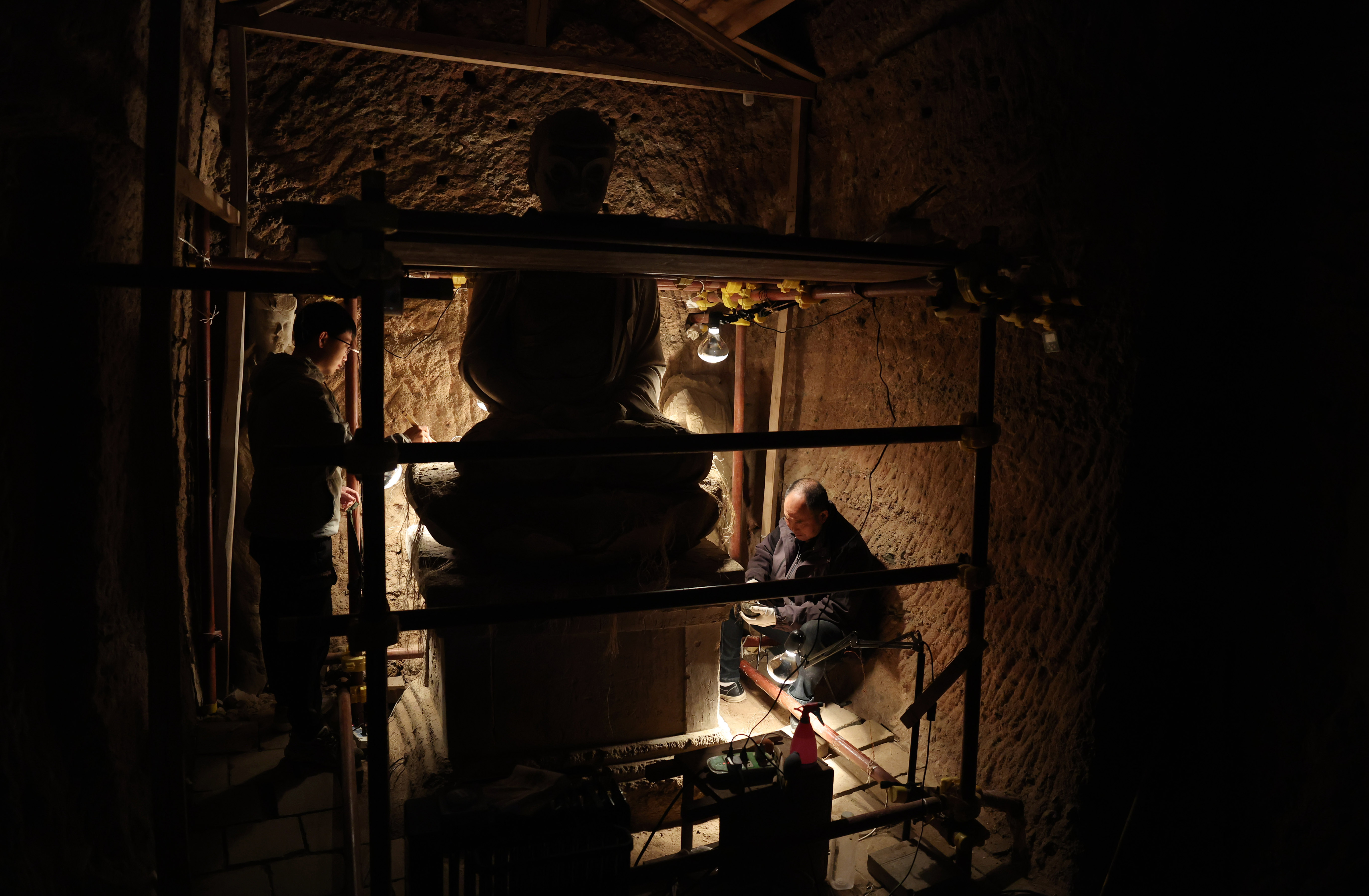 2024年11月2日,麦积山石窟艺术研究所保护研究室的高级文物修复师牟常有(右)和徒弟何举在麦积山石窟133窟内修复塑像。自1985年至今,牟常有在麦积山石窟艺术研究所工作已有四十年。经过多年磨砺,牟常有的文物修复技艺日臻成熟,面对年轻人的请教,他更是倾囊相授。“塑像壁画皆是凝固的历史,守护它们,需要耐心和毅力,相信年轻人能够接好接力棒,让这份珍贵的人类文化遗产永续。”牟常有说。