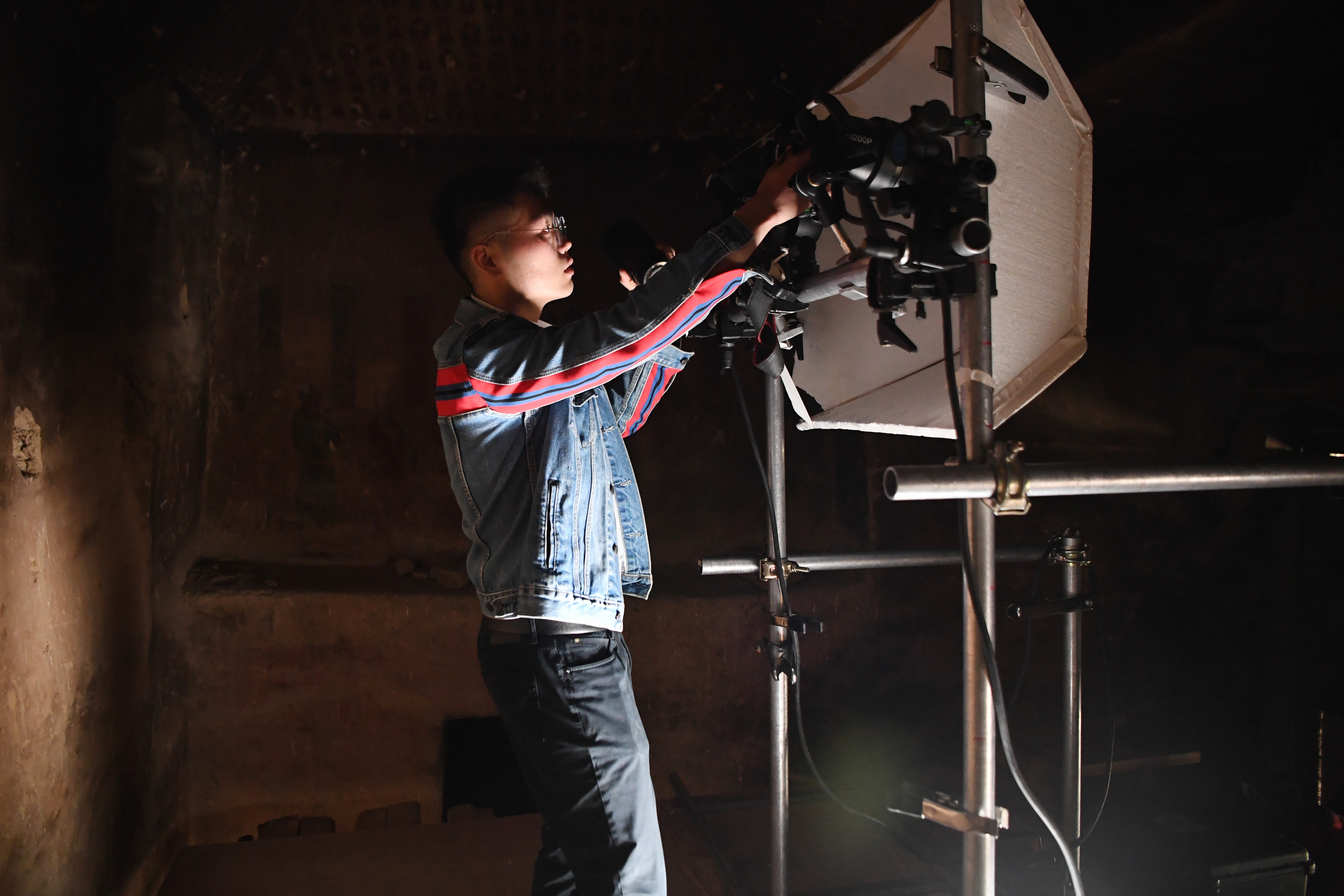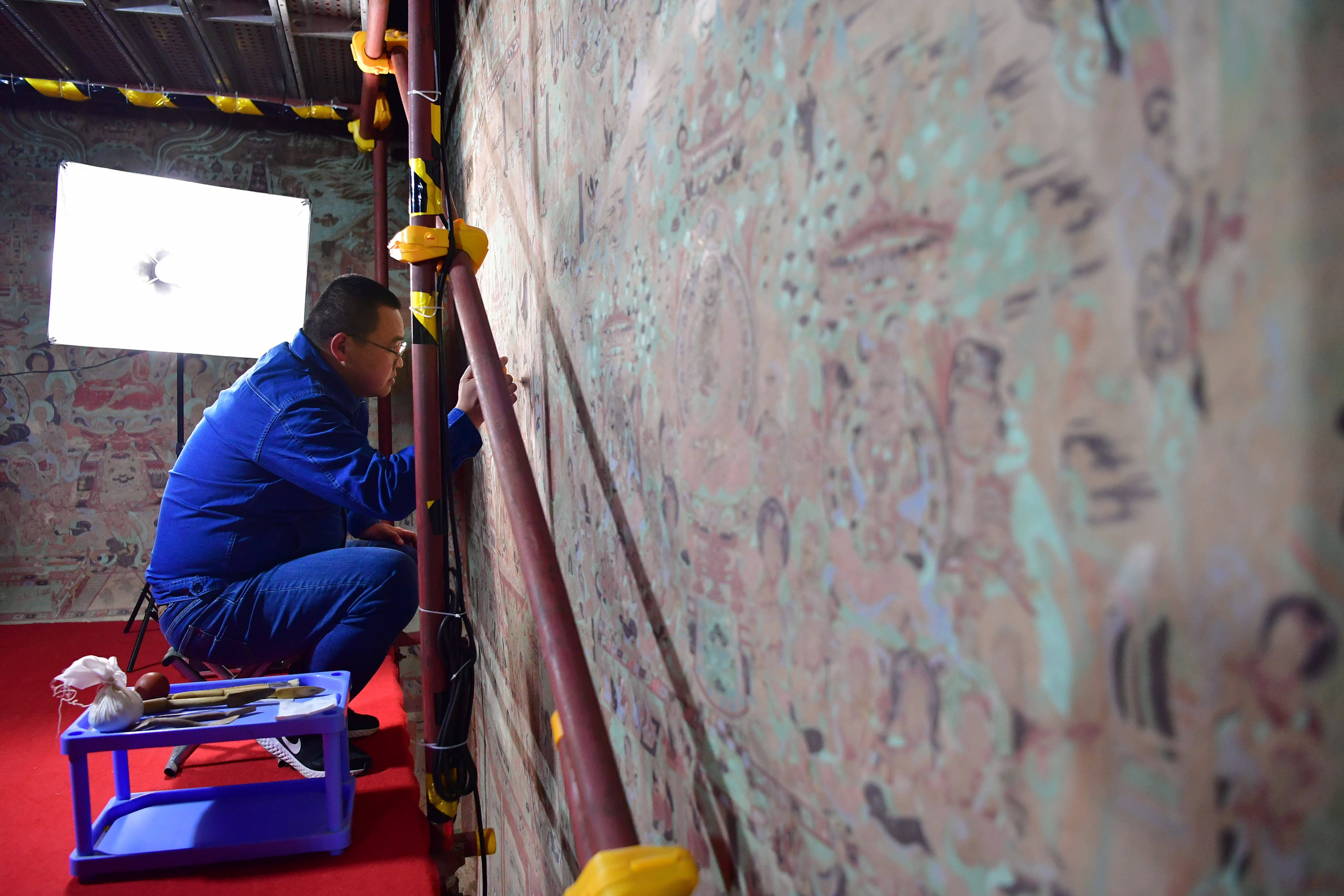 2023年4月25日,敦煌研究院文物数字化保护团队图像采集人员熊业腾在洞窟内调试设备,准备采集壁画图像。30多年前,敦煌研究院便尝试以数字技术让古老石窟“芳华永驻”。2016年,“数字敦煌”资源库上线,首次向全球免费共享30个敦煌石窟的高清图像和全景漫游,用户足不出户就能欣赏到高清的敦煌文化数字资源,目前访问用户遍布全球78个国家,累计访问量超过2000万次。