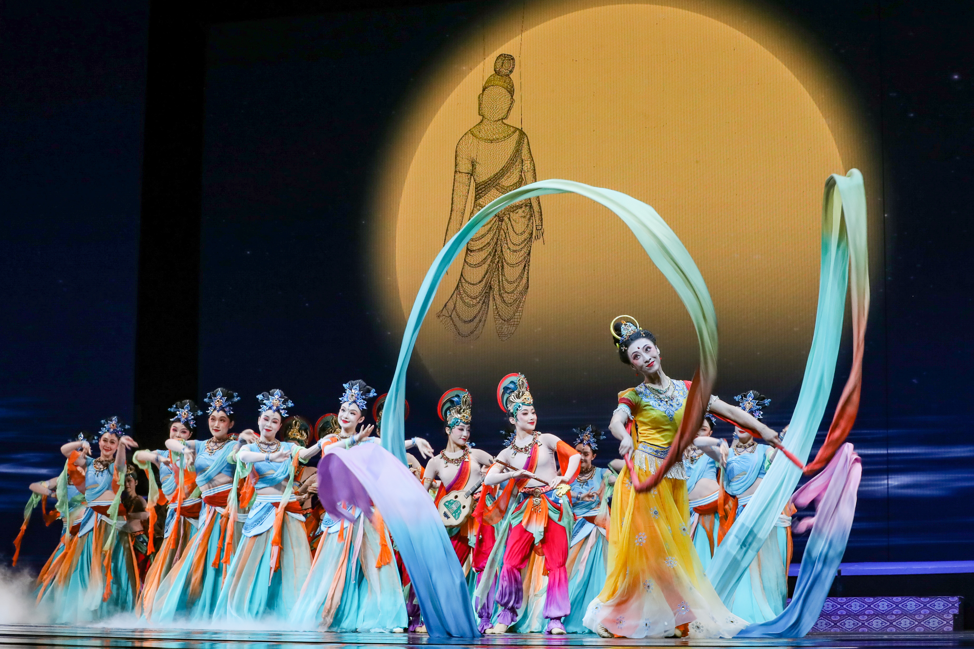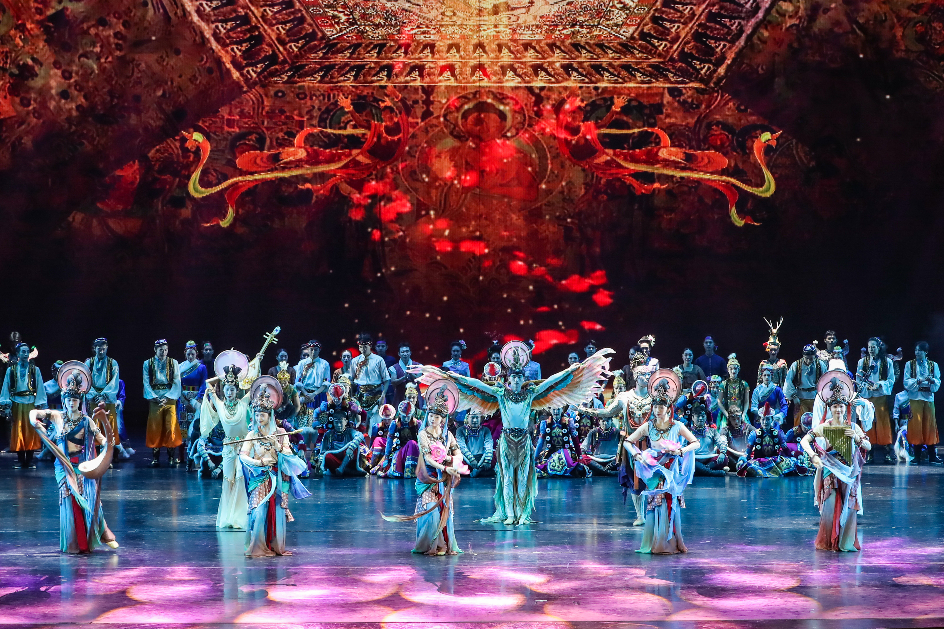 2025年9月20日,演员在敦煌大剧院表演新版《丝路花雨》。1979年,大型民族舞剧《丝路花雨》在中国西北诞生。编创者们从敦煌莫高窟的壁画和彩塑中寻找灵感,将壁画上凝固了千年的舞姿,转化为动态舞蹈语言。40多年来,《丝路花雨》累计演出超4000场,足迹遍布40多个国家和地区,被誉为“中国舞剧的里程碑”和“活的敦煌壁画、美的艺术享受”。此次新版历经两年半创排,通过复原与创新对经典艺术进行当代诠释,彰显了中华优秀传统文化的生命力。
