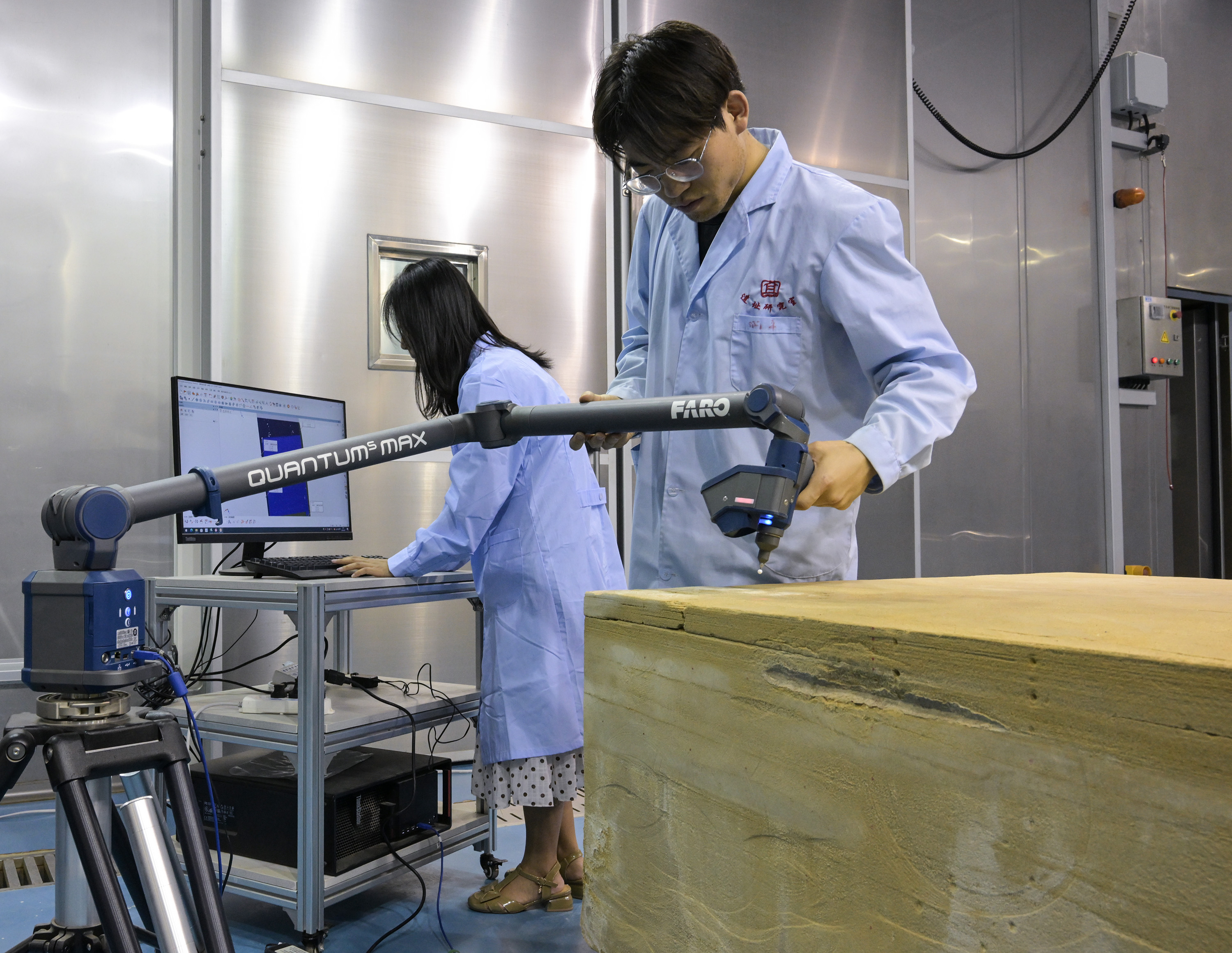 2023年8月3日,在敦煌研究院多场耦合实验室中,工作人员对庆阳北石窟寺砂岩样品进行三维扫描分析。2020年底,敦煌研究院建成我国文化遗产领域首个多场耦合实验室,实验室可模拟-30℃到60℃、10%至90%相对湿度以及风、雨、雪、太阳照射等各类气候条件,基础研究能力得到进一步提升。