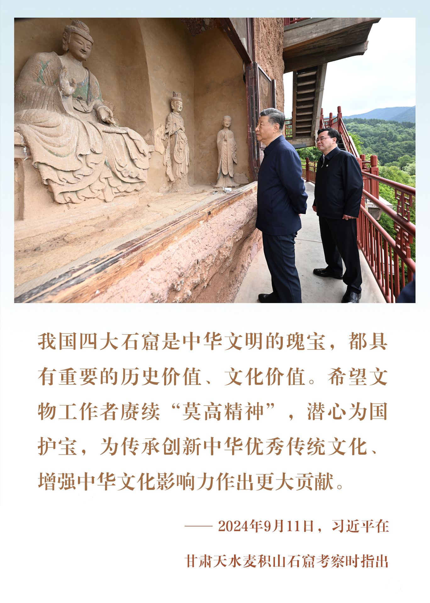 习近平总书记高度重视敦煌莫高窟、麦积山石窟等文化遗产的保护传承工作,在甘肃考察期间,数次作出重要指示: