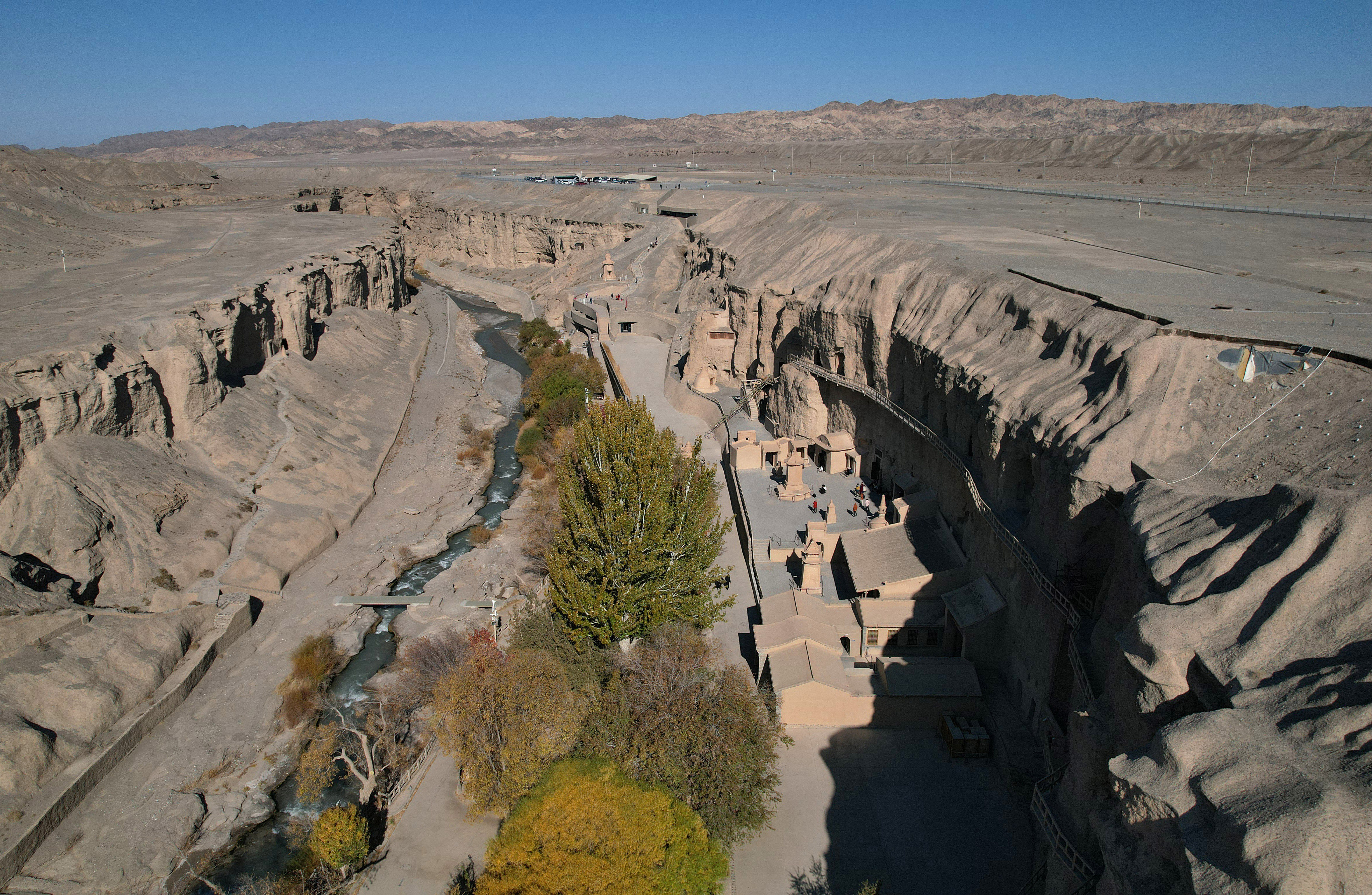 位于甘肃瓜州县的榆林窟(2025年10月31日摄,无人机照片)。