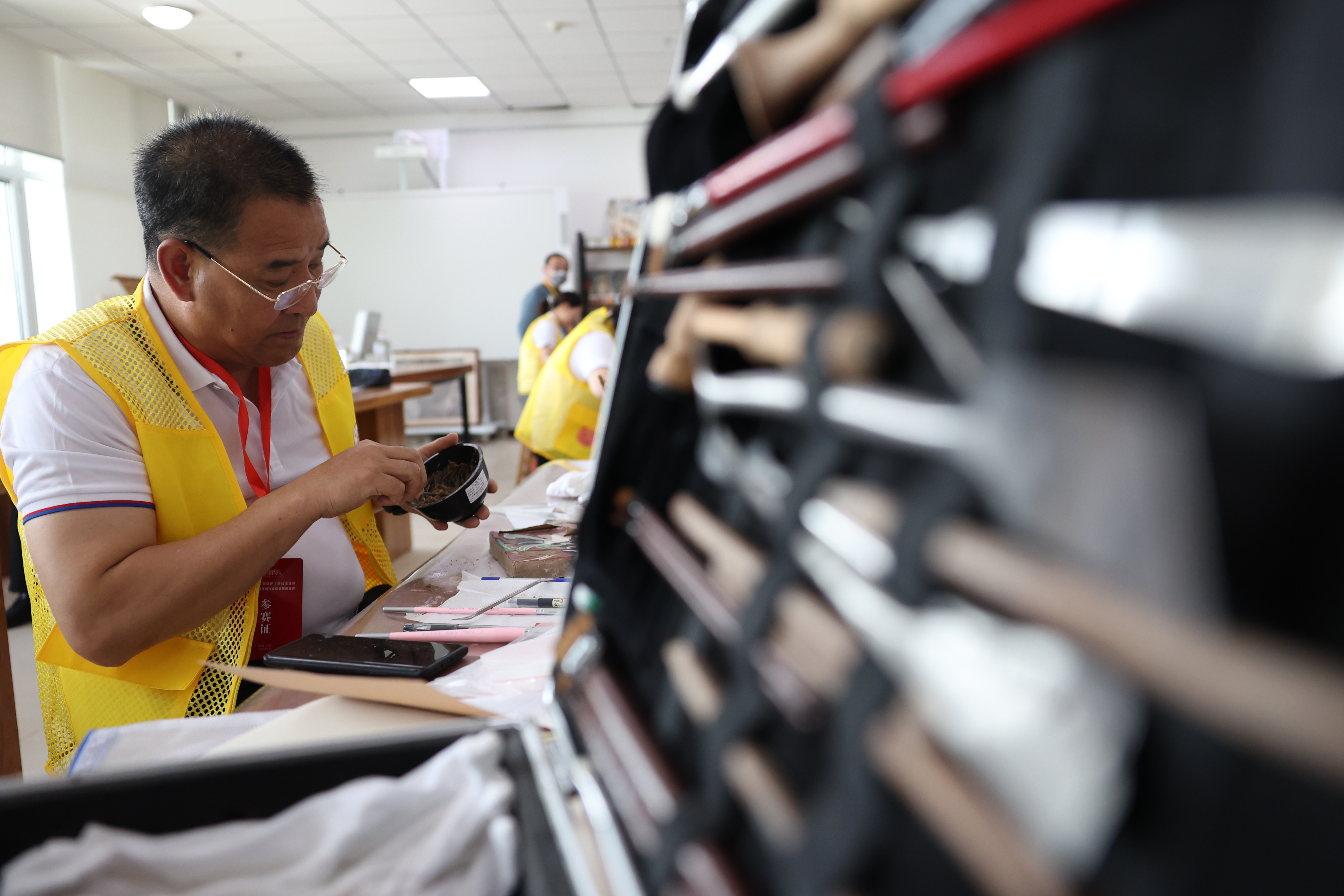 2025年5月21日至23日,西北四省(区)文物保护工匠技能竞赛暨甘肃省第一届文物行业职业技能竞赛在兰州举行,这是来自敦煌研究院的选手杨韬在壁画文物修复比赛中(2025年5月22日摄)。本次竞赛以“守护丝路遗产·锻造大国工匠”为主题,共设木作、泥瓦作、金属、陶瓷、纸张书画、壁画文物修复和考古勘探等项目,吸引了来自青海、宁夏、甘肃、新疆四省区的100余名文物修复领域的能工巧匠参赛,旨在通过竞赛进一步发掘文物修复和考古技能人才,助力中华文化瑰宝永续传承。