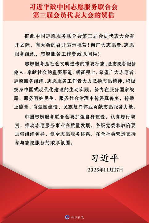 新华社北京11月28日电 在中国志愿服务联合会第三届会员代表大会召开之际,中共中央总书记、国家主席、中央军委主席习近平发来贺信,向大会的召开表示祝贺,向广大志愿者、志愿服务组织、志愿服务工作者致以问候。